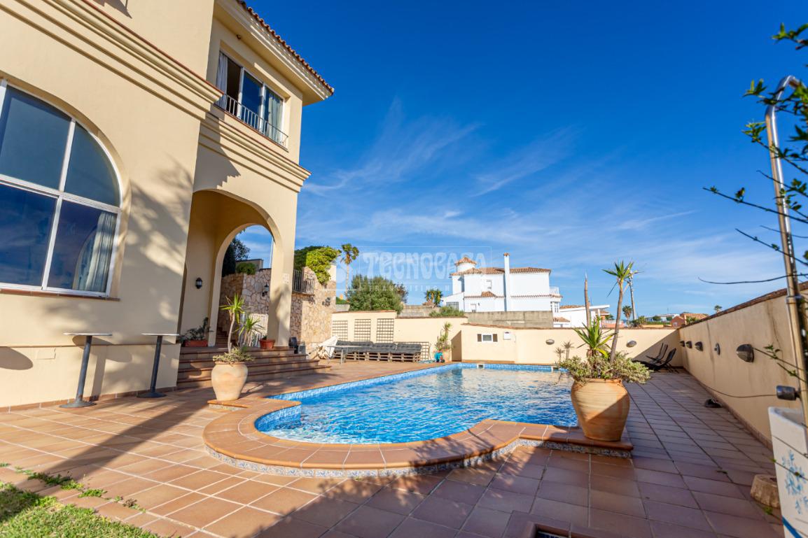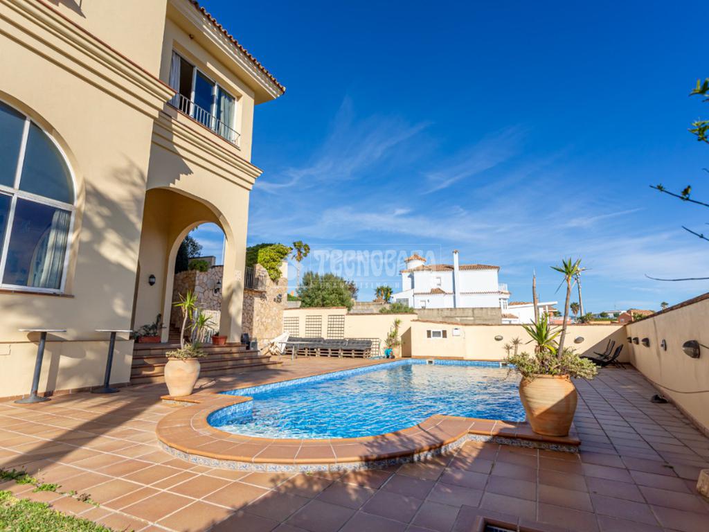 El patio rodea toda la propiedad aportando privacidad y múltiples ambientes exteriores. En la parte trasera encontramos una gran y hermosa piscina con vistas, acompañada por un enorme salón independiente con varias dependencias, un espacio versátil ideal como zona de ocio, celebraciones, gimnasio, área de invitados o cualquier proyecto personal que imagine.